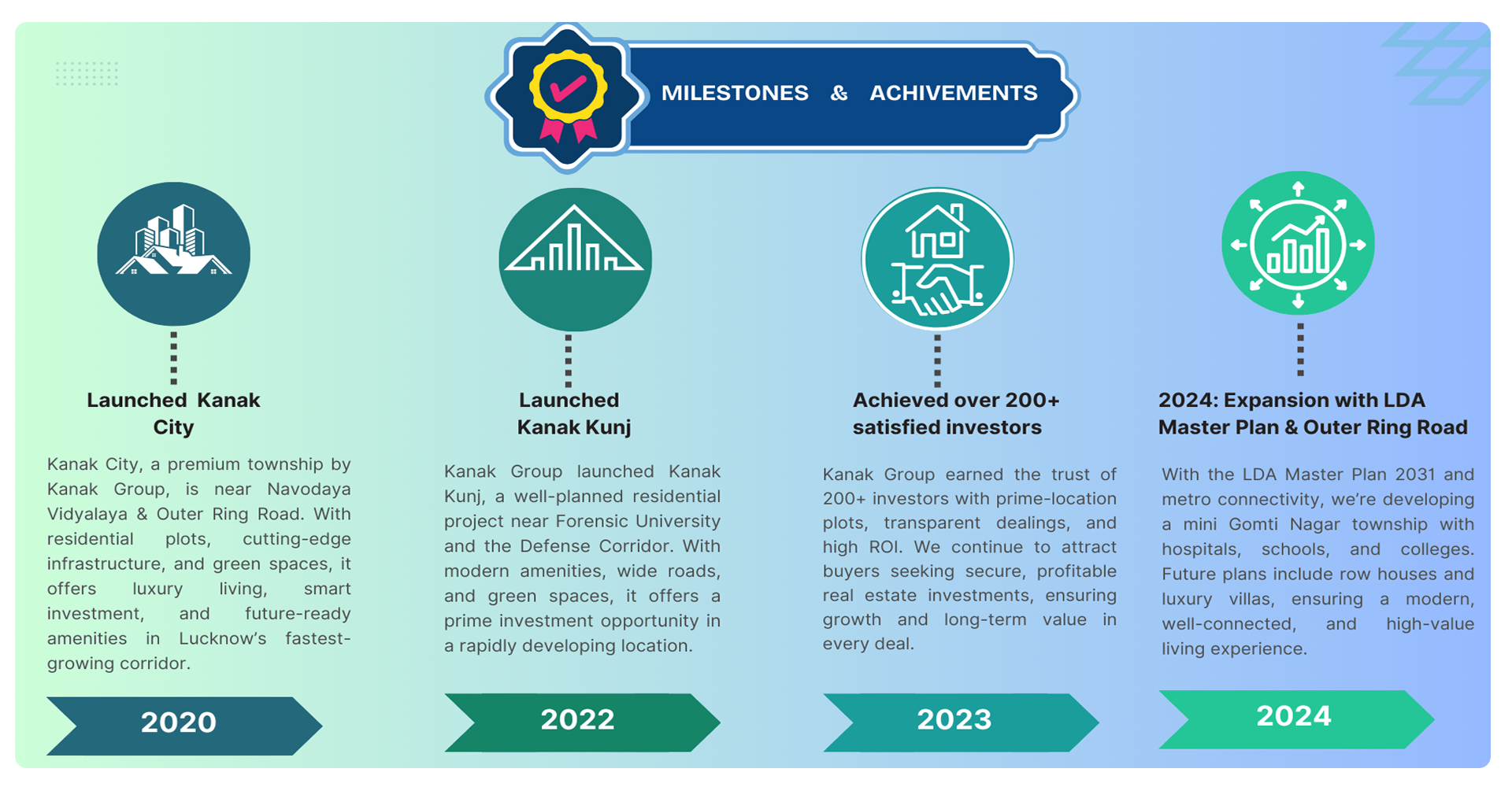 At Kanak Group, our journey has been one of steady growth and unwavering commitment to excellence in the real estate sector. With a focus on providing premium residential and commercial plots, we have established a reputation for trust, quality, and customer satisfaction. Over the years, we have expanded our footprint, delivering well-planned and strategically located properties that offer high returns on investment.